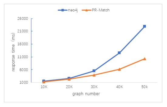 To study the effect of different scale data graphs on the efficiency of subgraph matching, we use GraphGen to generate five sets of small graphs, the graph numbers of each set are 10 K, 20 K, 30 K, 40 K and 50 K, respectively. We also get five large graphs generated by R-Mat, the number of vertices corresponding to the five large graphs are 2 million, 4 million, 6 million, 8 million and 10 million, respectively. The used query graph is a random graph. The query graph contains seven vertices. The experimental results are presented in Figure 9 and Figure 10. Comparative analysis shows that PR-Match has obvious advantages in large-scale data graphs and query response time increases slowly with the increase of data graph size.
