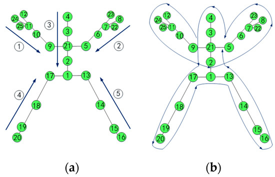 In order not to destroy the relation among these joints, the joints are numbered in a fixed order which determines the arrangements of all the joints. Considering that the human skeleton consists of such five parts as: one trunk, two arms, and two legs, we adopt two kinds of orders for skeleton arrangement: part-based order and traversal-based order [26]. Figure 2 shows two different orders on NTU RGB + D dataset [9] where one skeleton is composed of 25 joints. Then the whole interaction sequence can be represented as Equation (3)