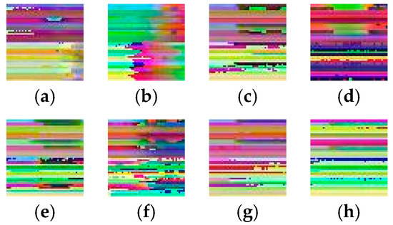 Sample feature images generated on NTU RGB+D dataset. (a) Kicking other person; (b) pushing other person; (c) patting on back of other person; (d) pointing finger at the other person; (e) hugging other person; (f) giving something to other person; (g) touching other person’s pocket; (h) handshaking.