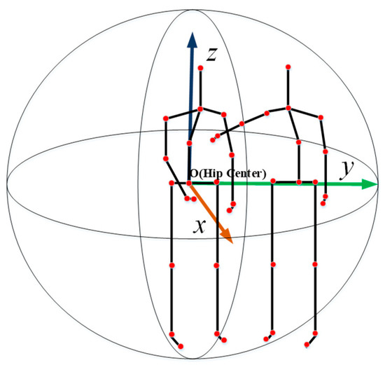 For the original NTU RGB+D dataset, we transposed the original coordinate system to human-centric coordinate system. Different from [30], we always chose the first person’s body center as the center of the coordinate system in order to better express the relative position between two subjects. Furthermore, coordinate transformation can eliminate the influence of different perspectives of actions. Figure 6 shows the proposed human-centric coordinate system. The formula of calculating transformation of coordinates is shown as (13)
