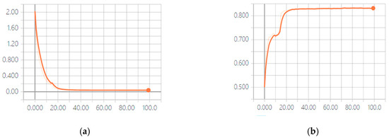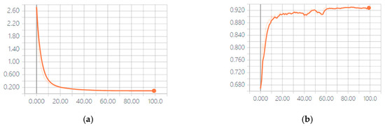For the training of the model, stochastic gradient descent algorithm with Nesterov acceleration with a momentum of 0.8 was adopted for optimization. The initial learning rate was set as 0.01, and decreased by a factor of 0.1 every 25 epochs. The batch size was 64 and the dropout rate was 0.3. After 100 epochs, the training process stopped. Figure 7, Figure 8 and Figure 9 show the training loss and test accuracy curves of the best performance of our methods acquired by product fusion for NTU cross-subject, cross-view protocols and SBU dataset independently. As can be seen, the convergence speed was very fast.