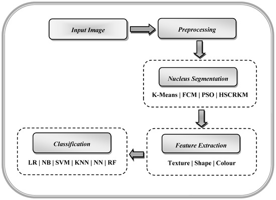 The rough set theory [4] was proposed by Pawlak in 1982. This concept is an extension of set theory for the study of intelligent systems characterized by insufficient and incomplete information. This classical rough set theory is based on equivalence relations, but it can also be extended to covering based rough sets [5,6,7]. In 1999, Molodtsov [8] proposed the concept of a soft set, which can be seen as a new mathematical approach to vagueness. The absence of any restrictions on the approximate description in soft set theory makes this theory very versatile and easily applicable in practice. Maji et al. [9] improved Molodtsov’s idea by introducing several operations in soft set theory. In [10], the researcher investigated a soft covering-based rough set as a new kind of soft rough set. This method is a combination of a covering soft set and rough set. In [11], a covering-based rough k-means clustering approach is applied to segment the leukemia nucleus. The advantage of covering-based subsets is that they generate upper and lower approximations by using the covering feature, which brings about more roughness. Since different clusters give rise to different results, determination of the number of clusters is a difficult task in clustering-based segmentation. To overcome this limitation, the hybrid histogram-based soft covering rough k-means clustering algorithm (HSCRKM) is introduced to segment the image of the leukemia nucleus. In this algorithm, the peak values of the histogram of an image are identified and the number of clusters is initialized. This will avoid the random initialization of a number of clusters. Here, soft covering approximation space is also included. The term ‘covering soft set’ is more accurate than ‘soft rough set.’ It also combines the strengths of covering soft set theory and the rough k-means clustering algorithm to effectively segment the image of the nucleus. Soft covering rough approximation is utilized to find the lower and upper approximation values. The performance of the HSCRKM algorithm is evaluated using existing algorithms such as k-means clustering, fuzzy c-means clustering, and particle swarm optimization (PSO)-based clustering. Different types of features such as GLCM-0, GLCM-45, GLCM-90, GLCM-135, and shape color-based features are extracted from the segmented leukemia nucleus image. Nowadays, a lot of machine learning algorithms are applied to predict the degree of sickness. The state-of-art machine learning prediction algorithms such as neural networks (NN) [12], logistic regression (LR) [13], support vector machine (SVM) [14], naive Bayes (NB) [15], k-nearest neighborhood (KNN) [13], decision tree (DT) [13], and random forest (RF) [16] are applied to classify the cancerous and non-cancerous leukemia cells. The empirical results show that logistic regression and neural network efficiently predict the blast and non-blast cells when compared with other prediction algorithms.