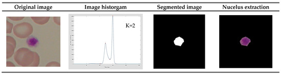After preprocessing, a novel HSCRKM algorithm is applied for leukemia nucleus image segmentation. The peak values of histogram are identified, and these values will automatically be assigned the number of clusters (K). In each iteration, the k value will change. The range of weight of the lower and boundary region in rough k-means algorithms is (. The relative threshold in the HSCRKM algorithm is defined as δ <= 1.0. The parameters’ values are assigned as . These values give possible stable results in rough k-means [30]. Figure 2 illustrates the segmentation results produced by the proposed HSCRKM algorithm.