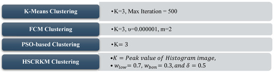 Küçükkülahlı [22] and Namburu [23] identified the number of cluster values in the clustering algorithm using the peak value of the histogram of an image. In [22], the automatic segmentation method using the histogram-based k-means clustering algorithm was developed. In [23], the soft fuzzy rough c-means clustering algorithm (SFRCM) was used to segment the MRI brain tumor images. The proposed SRFCM algorithm achieved a better Jaccard coefficient value of 0.97 for without noise and 0.79 for with 9% Gaussian noise when compared with the existing clustering algorithms namely, k-means, rough k-means (RKM), rough fuzzy c-means (RFCM), and generalized rough c-means (GFCM).