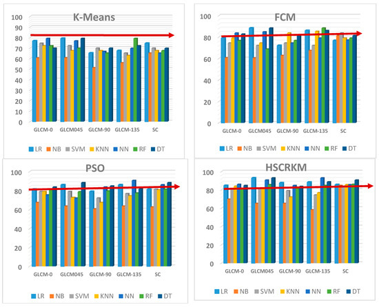 Figure 5 shows the overall prediction accuracy for various machine learning algorithms. With respect to k-means clustering, all the machine learning algorithms produce the lowest prediction accuracy i.e., below 80%. It is noted that with respect to PSO and FCM, some of the ML methods (i.e., logistic regression, random forest, and decision tree) attain above 80% prediction accuracy. With respect to the HSCRKM clustering algorithm, most of the ML methods (except naive Bayes) achieve above 80% prediction accuracy. It can also be inferred that the proposed HSCRKM clustering algorithm efficiently segment the nucleus, and the extracted features (based on the segments) probably increase the prediction accuracy. To interpret the experimental results, we are manually preserving the best accuracy range as above 80%.