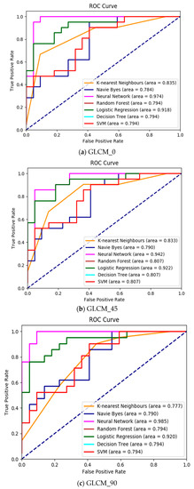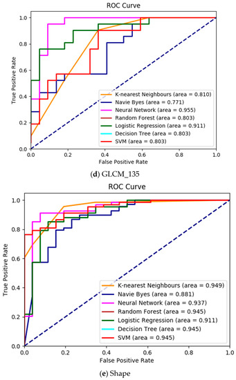Receiver operating characteristic (ROC) curve analysis is a widely used validation method to evaluate the diagnostic ability of the various prediction algorithms [44]. It can be generated by plotting the cumulative distribution function of the true positive rate versus the false positive rate. If the ROC curve of the prediction algorithm appears in the top left corner, then the algorithm accurately predicts disease. If it is closer to the diagonal line, then the performance of the prediction algorithm is less accurate. Figure 7 depicts the ROC curve analysis for the proposed algorithm HSCRKM. The ROC curve is generated for all the extracted datasets, namely GLCM_0, GLCM_45, GLCM_90, GLCM_135, and Shape_Colour. From Figure 6, we inferred that the shape and color-based feature datasets produce the highest accuracy values when compared to another dataset. It is noted that decision tree, random forest, and SVM attain similar prediction accuracy. So, the curves appear in the same orientation. It is also noted that the neural network (NN) and logistic regression (LR) algorithms performed better than the other machine learning algorithms. Those algorithms curve lines almost appeared in the top left corner of the graph. The naive Bayes algorithm curve line is executed near the diagonal line. So, this method probably attains minimum accuracy compared to the other ML algorithms.