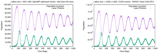 We checked that the simulation results of both parallel implementations reproduce the output of the original sequential one. As an example, we show in Figure 1, the time evolution of the total number of laser photons and the population inversion in the laser system for parameter values corresponding to a laser spiking regime. The results are the same as those found in previous publications with a sequential implementation, such as [21]. It is shown that the bigger the CA lattice size is, the smoother the results are, since the model reproduces better the macroscopic behavior of the system with a higher statistics.