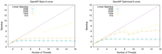 Speedup of the parallel OpenMP implementation running on a consumer-oriented CPU with eight cores. (Left): Basic implementation without in-depth optimization. (Right): Fully optimized implementation.