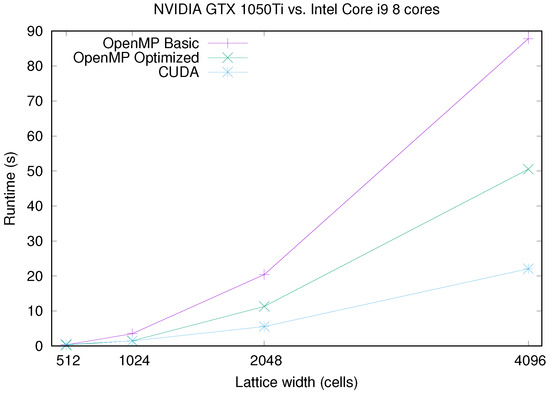 Runtime comparison between NVIDIA GTX 1050 Ti GPU and Intel Core i9 (eight cores) for different CA lattice sizes.