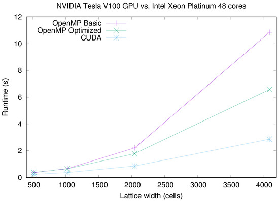 Runtime comparison between NVIDIA Tesla V100 GPU and Intel Xeon Platinum (dual socket with 48 cores in total) for different CA lattice sizes.