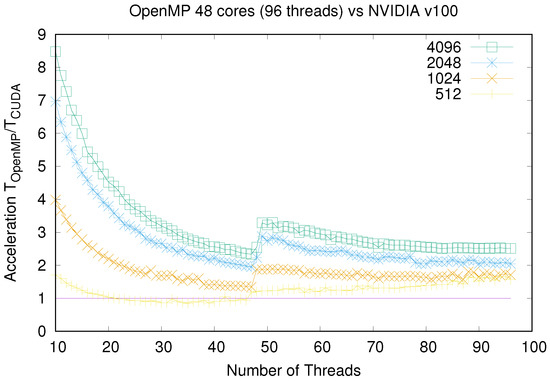 Comparison of OpenMP Optimized and CUDA times: Detail from 10 threads up when using Intel Xeon Platinum and NVIDIA Tesla V100 GPU, respectively.