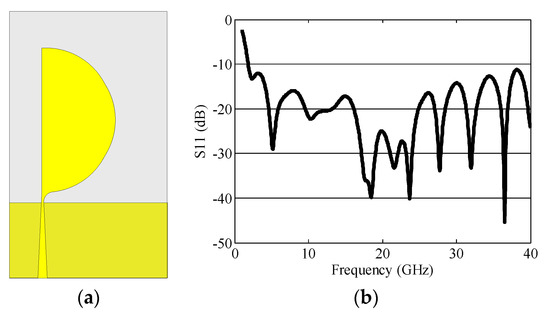 (a) The schematic design of single super wide band (SWB) antenna element and (b) S11.