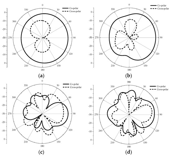The co- and cross polar pattern at (a) 5 GHz, (b) 10 GHz, (c) 20 GHz, and (d) 30 GHz.