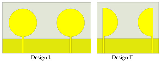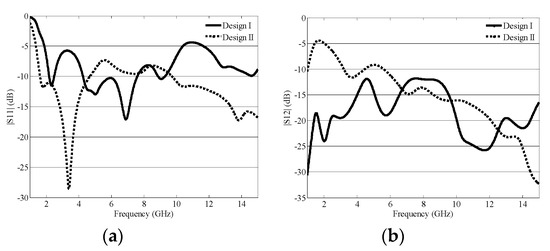 Two monopole antenna elements with circular shape radiator are chosen as shown as design I in Figure 3. The S-parameters for design I are depicted in Figure 4a,b. The design I shown in Figure 3 exhibits impedance mismatching for many frequencies, so the circular shape radiator was modified to a semi-circular shape radiator, shown as design II in Figure 3. The simulated impedance matching for semicircular shape radiator monopole antenna is shown in Figure 4a. The design II has comparatively better impedance matching than design I, where the coupling among antenna elements is very high as shown in Figure 4b. As the tapered feed line provides wideband impedance matching [7], the rectangular micro-strip feed line is modified to tapered feed line.