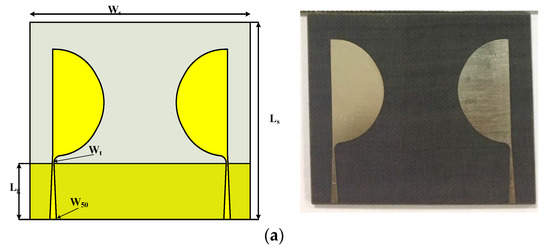 The schematic diagram of the proposed design with tapered feed line is depicted in Figure 5a. The designed MIMO antenna has compact dimensions of 40 × 47 mm2 (Ls × Ws), and the rectangular ground has a length Lg = 11.4 mm. The designed MIMO antenna’s tapered 50 Ω feed has a width of 1.4 mm which linearly decreases to wt = 0.25 mm.
