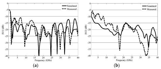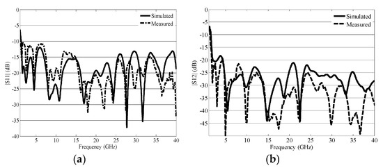 Simulations were carried out using Microwave studio computer simulation technology (CST) software. Finally, schematic design shown in Figure 5a was fabricated on F4B substrate with a permittivity of 2.65 and a thickness of 1.5 mm. The measurements were made by using a two-port Agilent N5245A PNA-X network analyzer. The measured and simulated scattering parameter of the manufactured antenna are given in Figure 6a,b. As can be seen, the measured scattering parameters validate the simulated scattering parameters. The impedance matching S11 is given in Figure 6a. From Figure 6a it is clear that S11 is less than −10 dB for the 1.3 GHz to 40 GHz. In addition, the measured and simulated S12/S21 is less than −10 dB; however, at some frequencies it increases, signifying that the isolation is very low at lower frequencies. Very little discrepancy is observed between the measured and simulated results owing either to the fabrication tolerance/manufacture accuracy or to the SMA connector.
