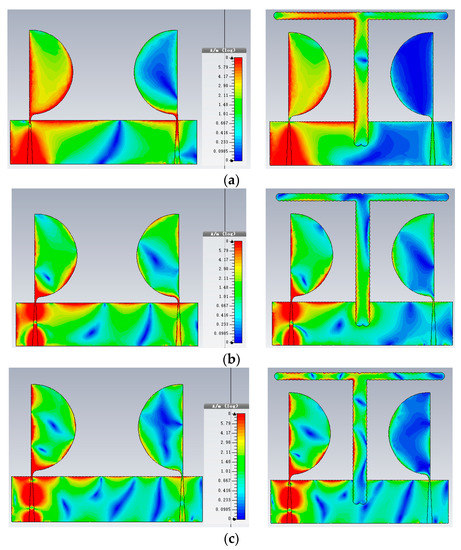 Surface current distribution without (left side) and with (right side) corrugated t-shape parasitic element at (a) at 5 GHz (b) 10 GHz and (c) 15 GHz.