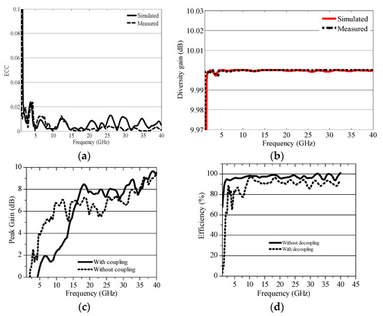 An ECC value of 0.5 has been set as a suitable value for diversity conditions. The ECC for the proposed MIMO antenna has been calculated from the scattering parameters using Equation (1) and a plot of ECC verses frequency is given in Figure 9a. The average ECC of the proposed MIMO antenna is 0.0073. Over the resonating band, the ECC is less than 0.02; however, the ECC slightly increases to 0.023 at 3.5 GHz. Diversity gain (DG) is another important parameter to measure the performance of the antenna. DG was calculated using Equation (2) and a plot of DG verses frequency is given in Figure 9b. From Figure 9b, it is clear that the DG is varying around 10 dB at all resonance frequencies. The peak gain with and without corrugated T–shape parasitic element is shown Figure 9c. The peak gain of the MIMO antenna increases; however, the gain of the decoupled structure is less than that of the MIMO antenna with no decoupling structure. The efficiency is varying around about 90% as shown in Figure 9c.
