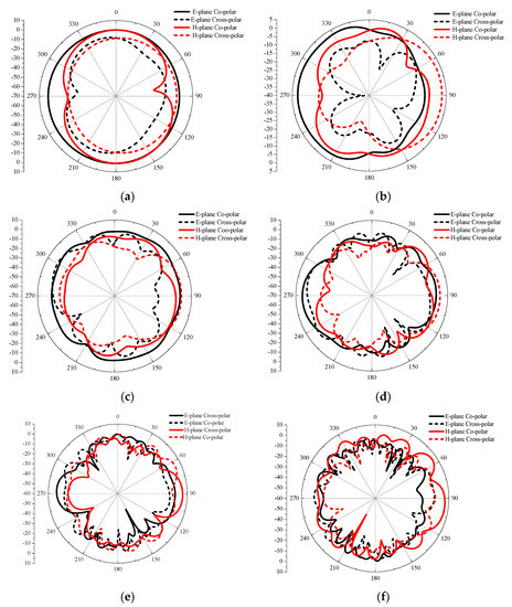 Another important characteristic is the radiation pattern. The far-field radiation pattern in the H-plane and E-plane is depicted in Figure 10 at six different frequencies (a) 5 GHz, (b) 10 GHz, (c) 15 GHz, (d) 20 GHz, (e) 30 GHz, and (f) 40 GHz. The proposed antennas exhibits nearly omni-directional pattern in H-plane and bi-directional pattern in E-plane at lower frequencies from 1.3 GHz to 10 GHz. At higher frequencies, nulls are generated in both H-plane and E-plane. In addition, the proposed antenna has high co-polarization at lower frequency. While, at higher frequencies the co-polarization is lower than cross-polarization level, mainly because of (1) excitation of hybrid current distribution (2) horizontal component of the surface currents increases. Overall, the designed wide-band MIMO antenna exhibit nearly stable radiation pattern and matches the behavior of the planar monopole antenna.
