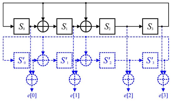 - Lowy, M. Parallel implementation of linear feedback shift registers for low power applications. IEEE Trans. Circuits Syst. Π Analog Digit. Signal Process. 1996, 43, 458–466. [Google Scholar] [CrossRef]