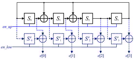 As shown in Figure 2, hardware redundancy [,,] is simply realized by duplicating the conventional LFSR [,,,,,,,,,,,] shown in Figure 1 to operate with the same functionality in parallel. Accordingly, this approach requires more than twice hardware resources compared to the conventional LFSR [,,,,,,,,,,,]. In contrast, as shown in Figure 3, the time redundancy [,] approach computes the same functionality using the same hardware resources in series, although additional registers are necessary to store and compare the outputs obtained at different times. The outputs of the first computation are stored in the lower registers activated by en_low and those from the second computation are stored in the upper registers activated by en_up alternately. Although the time redundancy technique [,] improves the reliability, it demands a latency that is two times longer than that of the conventional LFSR [,,,,,,,,,,,]. These examples indicate that the overheads resulting from the redundancy methods [,,,,] are as high as those of the conventional LFSR [,,,,,,,,,,,] and the overhead becomes more severe when the length N of the generator polynomial G(x) is large. Recently, more advanced redundancy technique is introduced targeting for error detection/correction adders [,,], which achieves error detection/correction using information redundancy. Information redundancy saves hardware resources but demands additional computation overhead. As far as we know, there is no such information redundancy approach for an error detection LFSR structure.