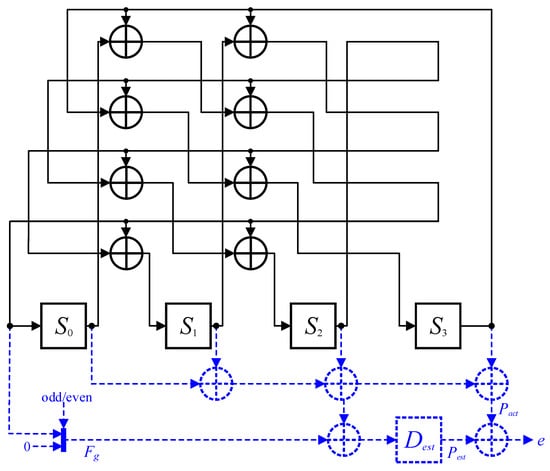 Figure 5 shows the operation of the proposed ED-LFSR in detail, where even generator polynomial x4 + x2 + x + 1 and odd generator polynomial x4 + x + 1 are exemplified. Fg indicates the output of the left-sided MUX representing the last term of (3) and S0, S1, S2 and S3 represent the output from the registers shown in Figure 4. Although both even and odd polynomials generate the actual parity Pact in the same way by XORing all the register outputs based on (4), the estimated parity Pest is determined in a different way according to the parity of the generator polynomial based on (3). When the generator polynomial G(x) is even, Fg is selected as F[i] leading from S3 as shown in Figure 5a. Otherwise, Fg is selected as zero as shown in Figure 5b. According to Figure 5, we can find that the estimated parity Pest[i] always have the same pairty as the actural parity Pact[i + 1] at the (i + 1)-th clock cycle. Therefore, the proposed ED-LFSR allows error detection at every clock cycle by comparing the estimated parity and actual parity.