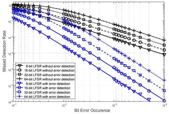 Figure 7 shows theoretical and experimental results for various lengths of LFSR with different error occurrence p ranging from 10−1 to 10−4. The theoretical results obtained from (5) are shown as lines and the experimental results obtained from simulations are indicated as markers. According to Figure 7, the experimental results are exactly fit in the theoretical results.