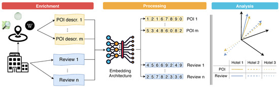 Figure 1 depicts the data analytics process, which entails the following steps: (i) Data enrichment: review data were enriched with textual descriptions of the surrounding POIs, which were acquired from open data repositories. (ii) Processing: reviews and POIs were transformed into a unified latent space, which was produced by a state-of-the-art sentence embedding model [5]. The latent model preserved the semantic relationships among textual words and phrases, thus allowing to correlate the review content with the POIs located in the hotel neighborhood. (iii) Analysis: review and POI embeddings were explored in order to gain insights into their possible semantic relationships.