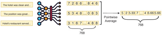 Thanks to the notable properties of the recently proposed vector representations of text [4], vectors in the latent space could be conveniently combined by performing basic vector operations. Specifically, review embeddings could be averaged by computing a pointwise average [20] over the vector dimensions in order to generate the vector representations of hotels = . Notice that averaging the vector components separately for each dimension allows us to generate an aggregated embedding vector with the same dimension.