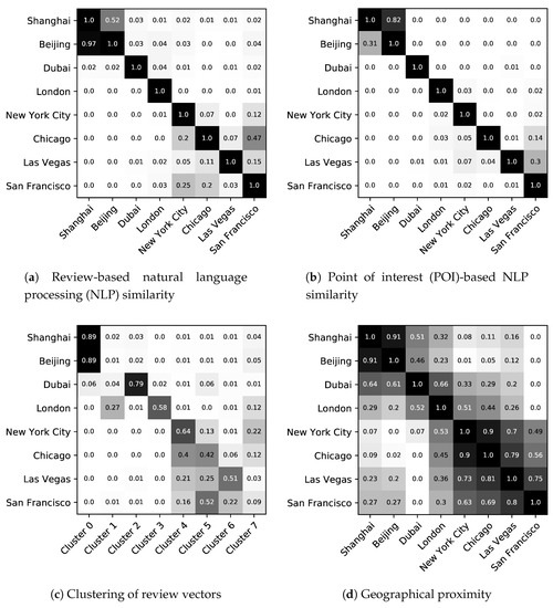 The heat-map charts depicted in Figure 3 show the city-to-city similarities computed on (i) the review embeddings (see Figure 3a) and (ii) the POI embeddings (see Figure 3b).