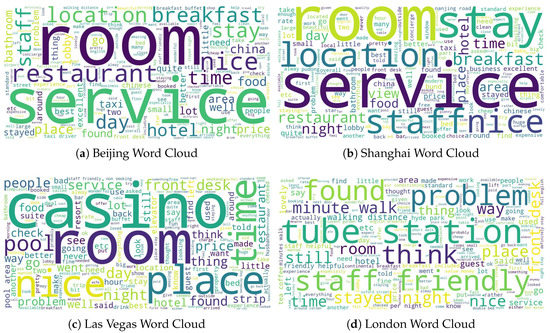 We note that Eastern cities (Figure 5a,b) were predominantly characterized by emerging terms related to the hotel itself and its services, meaning that a comfortable experience provided by the hotel was deemed worthy to be shared as it might not be so likely to happen. On the contrary, Western cities Figure 5c,d) also included important city-specific features such as landmarks and special attractions, such as “casino” and “tube station”. For this reason, we confirmed the experience in Western cities to be more related with the surrounding POIs, as reported in Figure 4a.