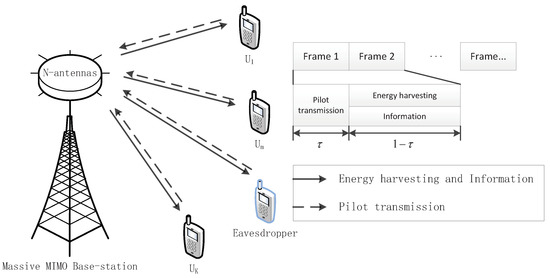 As shown in Figure 1, a single-cell downlink massive MIMO system with SWIPT consists of one BS connected with K users and one eavesdropper [17,18,19]. The number of transmitting antennas at BS is N, which satisfies . Each user and the eavesdropper are equipped with a single antenna. The BS simultaneously serves K users in the same time-frequency resource block [20]. Especially, it is assumed that the active eavesdropper perfectly knows the pilot sequence transmitted by the mth user node [21], where . Without loss of generally, we suppose that each time slot has a unit length. Each time slot has two parts. In the first time slot , users use the energy harvested by the previous time block to transmit pilot information to the BS. The active eavesdropper also transmits pilot information to the BS. In the time slot, BS transmits information or energy to users and the eavesdropper. The user’s terminal receiver decodes the signal into two parts; one part is used for information decoding, and the other is used for energy harvesting. The eavesdropper mainly is used for information decoding [15].