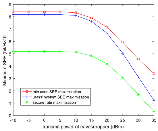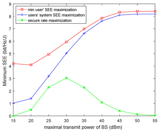 Figure 6 shows the minimum SEE of the three algorithms for a different number of users. The minimum SEE is monotone decreasing with the number of users. The minimum SEE obtained by SERA algorithms is about 3% and 62.2% compared with the users’ system SEE maximization and secure rate maximization algorithm when the number of users K is 4 and BS maximum transmit power is dBm. In addition, it can be observed that the minimum SEE performance of the SERA algorithm is better than the other two algorithms.