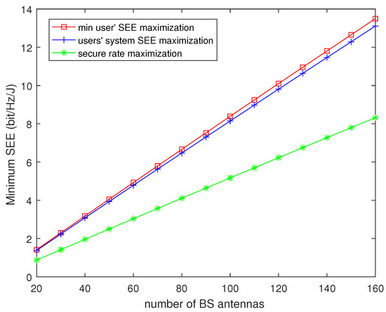 Figure 3 shows the minimum SEE of the three algorithms for the different number of BS antennas. The minimum SEE is monotone increasing with the antenna number of BS for three algorithms. This is because of the array gain due to the multi-antenna diversity. As the number of BS antennas increases, the secure rate of three algorithms increases faster than the power consumption. In addition, it can be observed that the minimum SEE performance of the SERA algorithm is better than the other two algorithms.