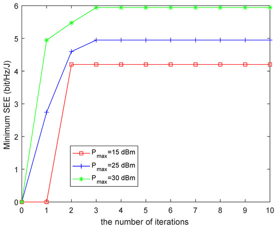 In Figure 4, we show the convergence performance of the different . It can be seen that the SERA algorithm can quickly converge. In the three cases under consideration, the number of iterations that the algorithm converges to the optimal value is within four times. When the number of BS antennas is , the numerical results reveal that the performance of the dBm has increased about 20.1% and 41.5% more than dBm and dBm.