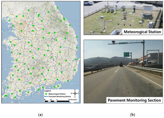 In this study, the data in the RPM dataset provided by the Korean NHPMS were used to predict the pavement condition index of the individual monitoring sections, whose locations are shown in Figure 1.