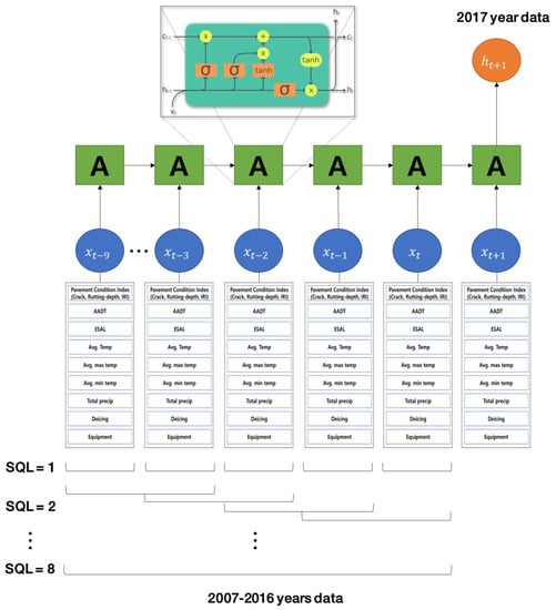 The following are some examples of the implementation process of the LSTM model. SQL 1 indicates that the pavement condition is predicted based on the t year pavement condition indicators and explanatory variables, while only considering the description variables of t + 1 (same as the NN algorithm). Moreover, SQL 3 refers to the use of data for three years (t − 2 to t years) to predict the pavement condition index for t + 1 years.