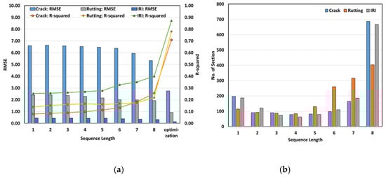 First, as shown in Figure 3a, the RMSE and the coefficient of determination (R2) in all of the sections, for each value of SQL, were examined. As the SQL increased, the RMSE decreased and the R2 values increased. When SQL was 8, the RMSE of the crack rate decreased by 19%, the rutting depth RMSE decreased by 19.4%, and the IRI RMSE decreased by 28.2%, as compared with the values when SQL was 1. The R2 for the crack rate increased by 221.8%, the rutting depth by 56.6%, and the IRI by 57.9%. This might be because the time series data required for the prediction of the pavement condition indices for the year 2017 were increased as the SQLs increased. Figure 3b shows the number of sections for which RMSE was minimized by each value of SQL. The RMSE was minimized when SQL was 8 for a large number of sections and for all pavement condition indices. This might be because, in the case of an SQL of 8, the trend of pavement deterioration in the past is reflected to the maximum extent.