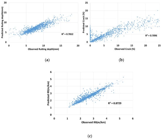 Coefficient of determination between predicted and actual pavement condition indices: (a) rutting depth, (b) crack, (c) IRI.