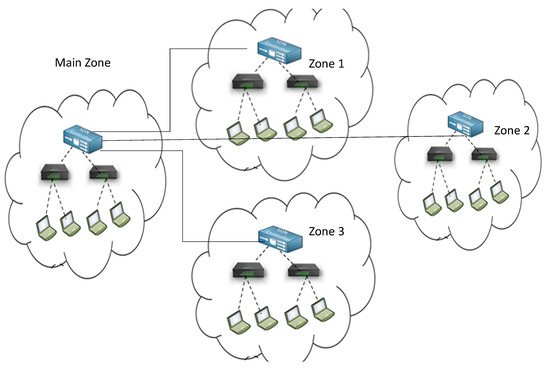 Kalghoum et al. in [11] suggested a novel architecture Forwarding-Content-Caching and Routing Name Data Networking based Software Defined Networking (FCR-NS). This model resolves the three main issues related to forwarding strategy, speed of router, and cache replacement policy. The authors state that the existing architectures are using the best-route forwarding strategy that causes wastage of different resources. The reason behind the slow processing is the visiting of the Content Store (CS) table, Pending Interest Table (PIT), and Forwarding Information Base (FIB) table for searching the request message and lack of efficient cache replacement policy. The authors resolved the problems as mentioned above by using both the concept of decoupling of SDN and set bloom filter tables. The efficient cache replacement strategy is calculating the switches’ popularity on a real-time basis. The SDN controller manages the fast-intra-zone routing, and the bloom filter (BF) tables are using to manage the fast inter-zone routing process. The default policy for content caching is leaving a copy of the request message on all routers on the path. This policy leads to content redundancy in the network and resource consumption. The authors suggest an architecture of several zones, as shown in Figure 1, and these are further divided into two main planes, the data plane and centralized SDN controller, which is further composed of four tables.