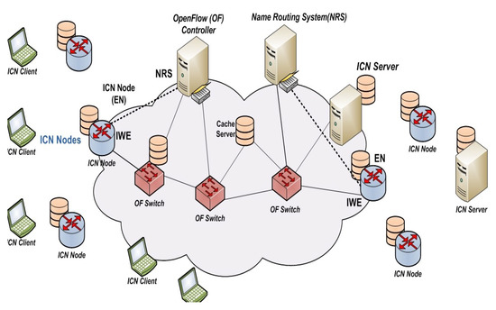 The authors in [14] implemented a new architecture, called OFELIA, as shown in Figure 2. The OFELIA project is a pan-European experimental platform open to researchers based on OpenFlow. In the proposed architecture, “Inter Working Elements” (IWE) in the ICN node translates regular ICN format of non-Openflow to Openflow format and vice versa. Cache server is implemented outside the SDN switch (OF-switch). This approach can also be called the centralized caching approach.