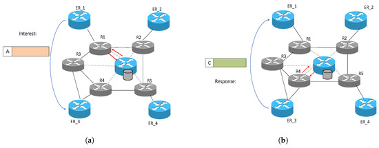 The working of the proposed approach in [8]; (a) interest forwarding; (b) response forwarding.