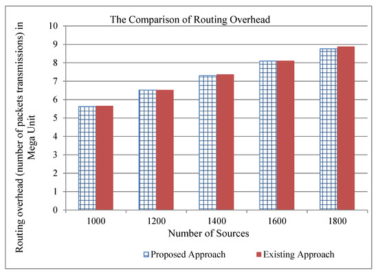 For performance comparison, we took the network traces from the website (https://github.com/fg-inet/panoptisim). We assume that there are 2590 hosts that are accessing/sharing 10,000 files. The traces have 415 forwarding devices. Furthermore, we assume a file of size chunks and a chunk of 1500 bytes. Moreover, we assume that the cache server can process 1200 content requests per second and storage capacity of chunks. Our simulation runs on desktop Intel CPU i3, which runs Fedora Linux 23. The exiting scheme [28] deploys the cache servers using the values of path-stretch, betweenness, and closeness centralities. We analyze the performance comparison of the existing approach [28] and our proposed approach in terms of computation time and traffic overhead. We present the results considering the number of cache servers from 1 to 3, and the number of sources requesting the contents from 1000 to 1800. The traffic overhead shows the number of transmissions at the network layer. Table 2 shows that the computation time of the existing approach increases as the number of cache servers is increasing. In our assumed simulation environment, it took about a month to compute the location for three cache servers. However, the proposed approach can compute the importance of all switches in a few seconds. Our proposed approach reduces not only the computation time, but also reduces the traffic overhead when there is more than one cache server as indicated in Figure 4, Figure 5 and Figure 6. From these figures, one can also note that the reduction of traffic overhead increases as the number of sources increases. Thus, our proposed approach solves the problem by reducing not only the computation time, but also decreasing the traffic overhead in the network.