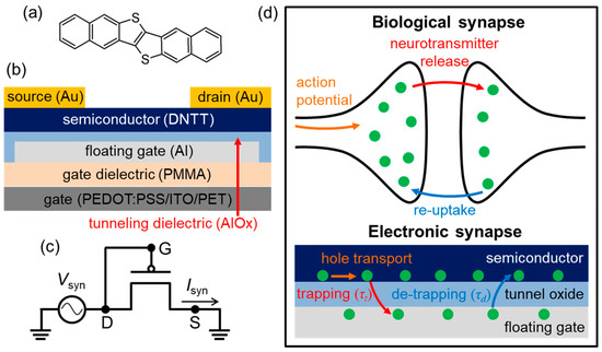 (a) Chemical structure of dinaphtho[2,3-b:2′,3′-f]thieno[3,2-b]thiophene (DNTT), used as an active molecular material in organic synaptic transistors. (b) Cross-sectional illustration of the device structure. (c) Circuit diagram employed for the measurement of voltage-dependent synaptic plasticity. (d) Model illustration: Biological processes relevant to the neuronal signal transmission through release and re-uptake of neurotransmitters and the electronic processes that mimic such properties through trapping-mediated hole transport at the semiconductor channel.