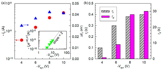 (a) The change of I0 and ΔEF as a function of voltage, estimated by the correlative approaches. Inset: the log-log plot showing the quadratic dependence of the final current on the synaptic voltage. (b) The extracted time constants for the trapping and detrapping processes.