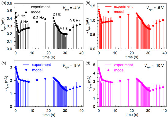 Comparing the experimental and model-reproduced STP (short-term plasticity) in organic synaptic transistors, with the magnitude of Vsyn being (a) −4 V, (b) −6 V, (c) −8 V, and (d) −10 V. The test measurements consisted of six steps, the frequencies of which are denoted in (a). The same test condition applies to all the other panels.