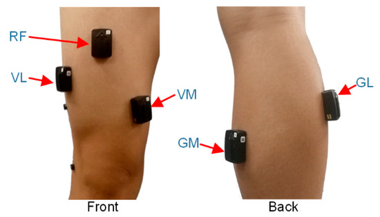 The unilateral lower limb of the human body contains at least 30 muscles that drive 7 degrees of freedom of the lower limb. Since the knee is a vital joint in the lower limb, we have chosen it as the key aspect in our research. The sEMG signals related to the knee of the unilateral leg were obtained by Trigno wireless sEMG instrument. To obtain better sEMG signals, several muscles that are easily detected were selected, including the vastus lateralis (VL), rectus femoris (RF), vastus medialis (VM), gastrocnemius medialis (GM) and gastrocnemius lateralis (GL). The adhesive positions (shown in Figure 1) of the surface electrodes are the positions recommended by SENIAM [22]. Before the experiment, the skin surfaces, where the electrodes had to be placed, were shaved and then cleaned with alcohol. This was done to reduce the impedance between the measured skin and electrodes and also to improve the sensor–skin contact.