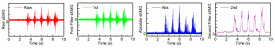 The sEMG signals were focused on the time domain because of the time-sequence. The amplitude extracted from the raw sEMG signals was used for the training of the RFPCA, similar to the work done by the authors of [16], who directly used the envelopes of the EMG signal to train the network. This feature was carried out from digital filtering and using simple math. A Butterworth band-pass filter (band length of 10–500 Hz, 4th order) was used to filter interference signals and extract effective signals. After that, a full-wave rectification of the sEMG signal was conducted, and the signal was then filtered through a low-pass filter (Butterworth at 6 Hz, 2nd order) [23]. One of the representative examples of the sEMG signal processing of one trial is shown in Figure 4.