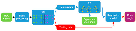 Because of the complexity of the sEMG signal and the differences between subjects, it is hard to establish a general mathematical model to represent the mapping relationship from sEMG to the knee angle. Furthermore, the biomechanical model describing the relationship between the sEMG and joint angle is also complicated and difficult to construct for practical application. Therefore, to establish a universal sEMG–angle model of a human joint, with a learning function, this study adopted a novel model-free method using random forest (RF) in combination with principal component analysis (PCA), in order to set up the estimation model between sEMG signal and knee movement. It is expected that this coupled ML method will be able to handle the estimation issue for different participants with a parametric adaptive approach. The input of the model is the processed sEMG, and the output is the knee angle.