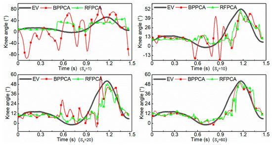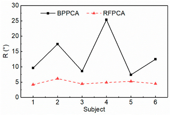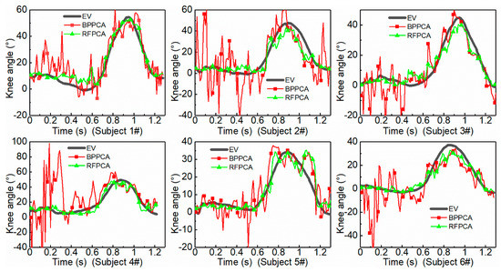 Furthermore, the evaluation metric R of different models for different subjects when n = 2 is depicted in Figure 10. The R of RFPCA is almost 5°, while the BPPCA has a poor prediction ability of the knee angle estimation, showing a large variation between different subjects, with errors ranging between 7° to 25°.